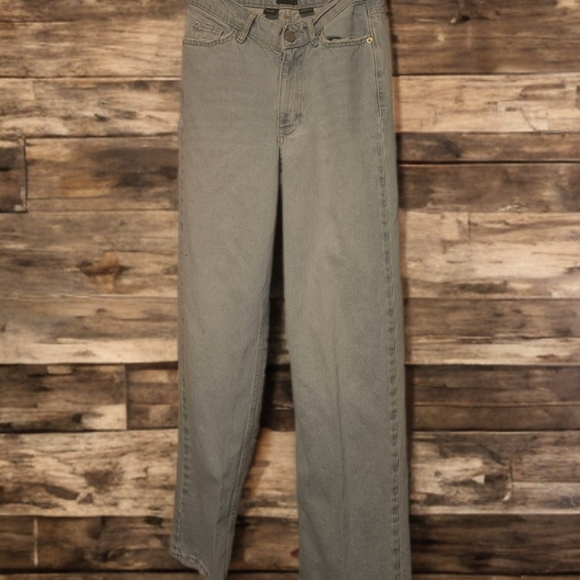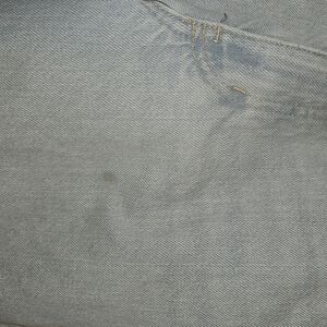 Stylish sky blue jeans with a dipped V flare. Perfect for casual wear. Small spot on left thigh.