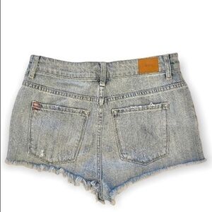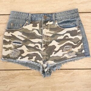 BDG Urban Outfitters Size 6 (28) High Rise Dree Cheeky Distressed Camo Shorts Denim. Shortie. Preowned. Nice condition. Factory distressed and frayed. Cutoffs. Waist measures approx 28”. Rise measures approx 12.25”. Inseam measures approx 1.5”.