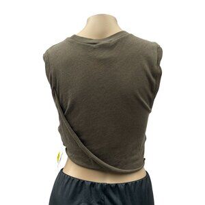 This sleeveless crop top offers a relaxed, modern aesthetic. The olive green tone and soft cotton blend make it an adaptable choice for various casual settings.