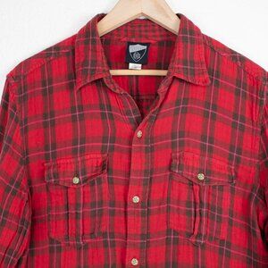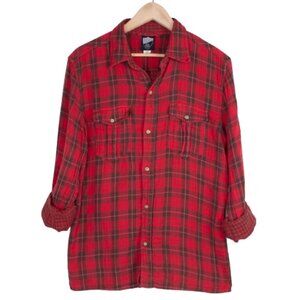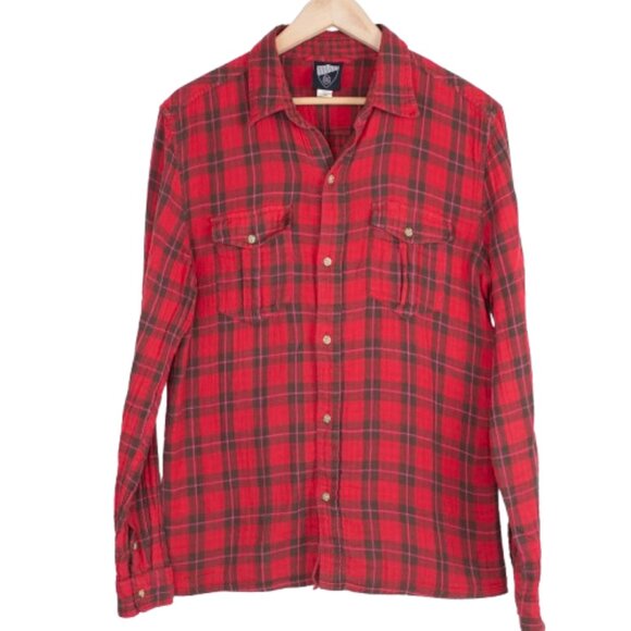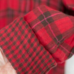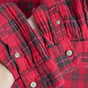 BDG Urban Outfitters double-layer cotton in a red plaid. Women’s Medium. This shirt has a soft, lightly textured waffle-knit style and features contrasting check cuffs that show when the sleeves are rolled — a signature BDG detail.