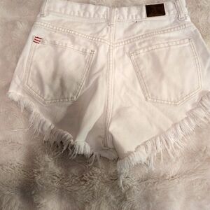 The BDG Urban Outfitters Shorts for women in size 27 feature a high rise and cheeky cut off style in white denim. These shorts have a zip and button closure, with accents like fringes, button and zipper details, and the brand's logo. The 5-pocket design adds functionality to the comfortable and versatile shorts, perfect for casual occasions or travel during the summer, fall, or spring seasons. Made from 100% cotton denim and machine washable, these shorts reflect a festival, bohemian, or classic theme, making them a stylish and trendy choice for various activities like walking, beach trips, or school.