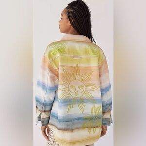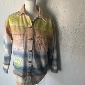 Stand out in this one-of-a-kind vintage-inspired shacket, crafted in sturdy denim-like fabric with a soft gradient wash of earthy tones. This piece features unique embroidered details, including a radiant sun motif, delicate floral accents, and geometric stitching that give it an artistic, bohemian vibe.