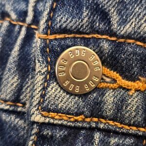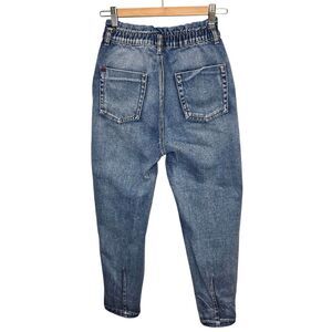 BDG Women's 24 Medium Wash Elastic High Waist Blue Denim Mom Jeans. Front zip fly closure. Elastic high waist. Front pockets and 2 back pockets. 100% cotton.
