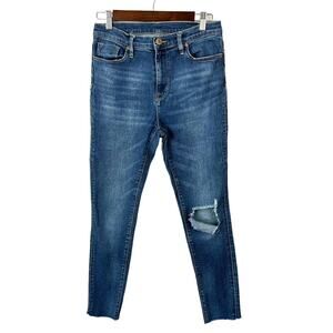 Super comfortable and flattering BDG cropped twig high rise distressed jeans with raw hem and hole at the knee Whiskering throughout. 5-pocket styling.