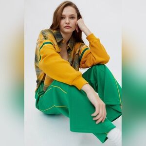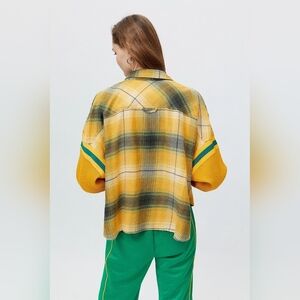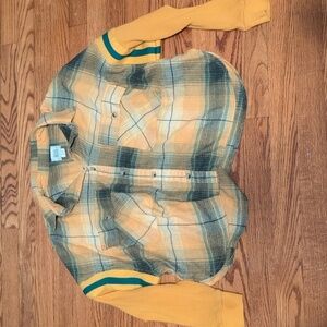 NEVER WORN! Stylish yellow and green plaid shirt with long sleeves. Features a classic button-up design and two front pockets.