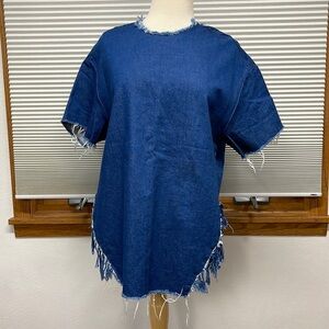 NWT BDG by Urban Outfitters Dark Blue Vintage Denim Raw Hem Boho Fringe short sleeve Top