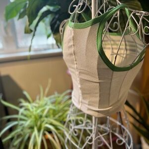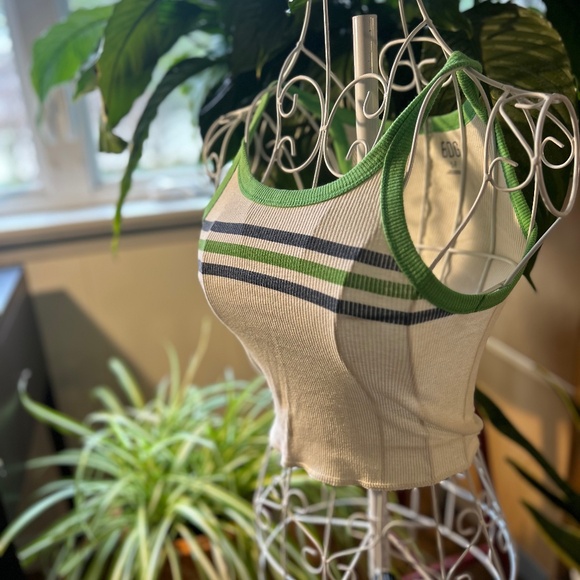 BDG cropped tank top, ribbed fabric, white with green and navy stripes, size S, cotton blend. Good condition.
