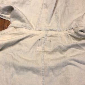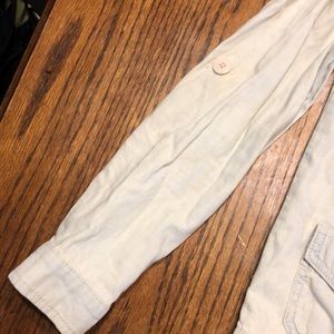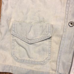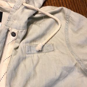 Really cute shirt like jacket bought at urban outfitters and never worn. The material is a lightweight denim which has the appearance of a shirt with front snap pockets and snaps in cuffs. It zips and snaps shut with a cute drawstring hood .