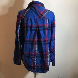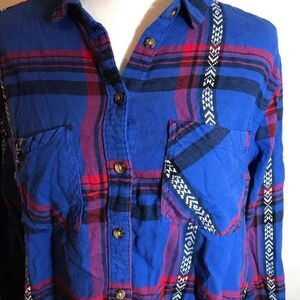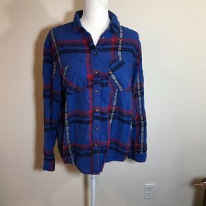Such a cute button up! Has an embroidered design all over. Two front pockets. Size medium. Blue and red color