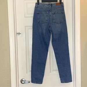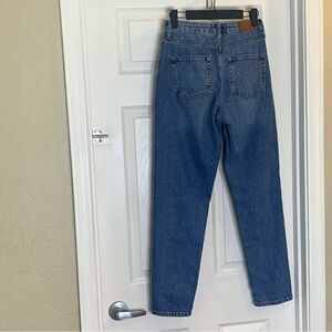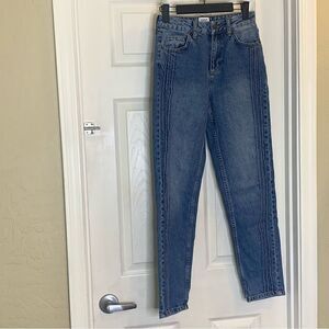 Size 25 Mom Jean style Denim side stripes Waist 13” flat Rise 11” Leg opening 5.5” Inseam 28”