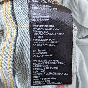 Excellent used condition. Five pocket high rise slim style with distressed knee. Cotton and 2% spandex gives them good stretch.