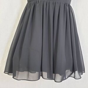 Turn heads in this stunning black cocktail dress by B. Darlin, size 5/6. Designed with a flattering fit-and-flare silhouette, this sleeveless dress features a sweetheart bodice with an illusion mesh halter neckline adorned in glamorous gold and bronze beadwork and rhinestones. The flowy chiffon skirt is lined with crinoline for added volume and movement. Perfect for prom, homecoming, formal parties, or any special night out, this dress brings elegance and sparkle with every step.
