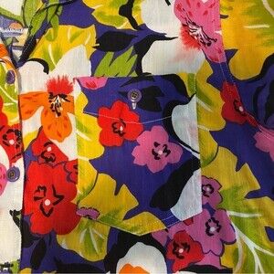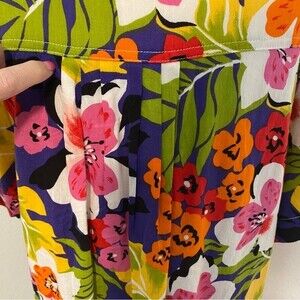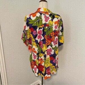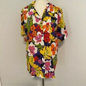 BE Floral Tropical Blue Purple Pink Green Short Sleeve Button Front Blouse SZ L