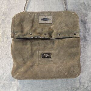 THEME/STYLE: suede, python embossed, studded, shoulder bag, chain strap, turn lock, gray, medium size, leather trim, edgy, glam, evening bag, statement bag, metallic hardware, be and d, rare, y2k, vintage inspired,Embossed Chain Strap Studded