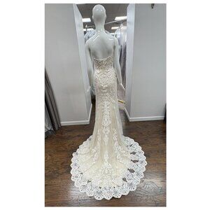 This breathtaking fit-and-flare gown features intricate lace appliqué throughout, creating a luxurious and timeless look. The flattering V-neckline and delicate straps beautifully frame the bodice, while the open back adds a touch of modern elegance. The highlight is the stunning scalloped lace train, which flows gracefully behind for a truly show-stopping entrance. Perfect for the bride who wants to blend classic romance with unforgettable detail.