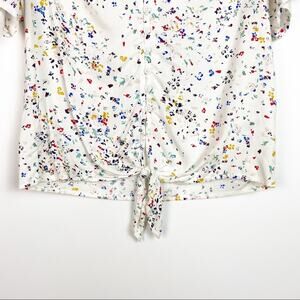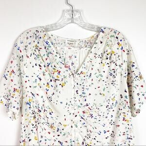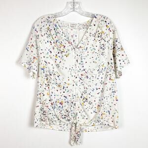 Beachlunchlounge confetti top in white. Multicolor confetti type pattern on light breezy short sleeve top. Tie accent at hem. Button up front. Size XS. Excellent used condition. No flaws detected. Please check measurements provided for fit.