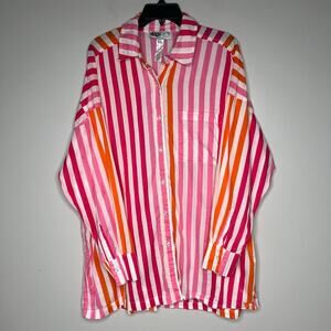BEACH RIOT Alexa Coverup Button Down Top Size PL Pink Orange Stripes Long Sleeve