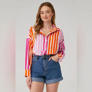 The Alexa Top , lightweight button-down, collared cover-up featured in pink, orange and white stripes