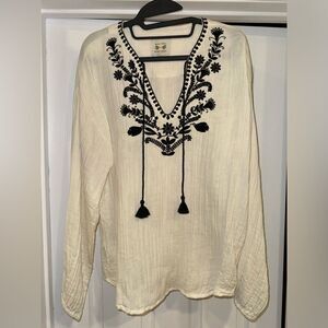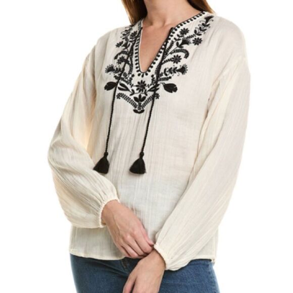 This women's blouse features an embroidered neckline and elasticized cuffs for a touch of elegance.