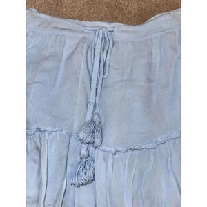 Elevate your summer wardrobe with the BEACHGOLD mini skirt in a stunning blue hue. This lightweight, short skirt features a solid pattern and is crafted from soft rayon for ultimate comfort. The elastic waist ensures a perfect fit, while the lace trim and tassel tie accents add a touch of boho-chic flair. Ideal for beach outings, casual brunches, or summer festivals, this versatile piece is a must-have for any warm-weather occasion. New with tags (NWT).
