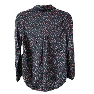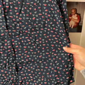Pre owned excellent condition. One minor flaw is it’s missing one button and needs a replacement. WOMENS size xs. Super cute heart and lip print blouse.