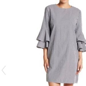 Beach.Lunch.Lounge 3/4 ruffle sleeve black & white checks checkered gingham midi dress. Crewneck with keyhole button closure at the back. Two side pockets. Extra button included as shown