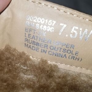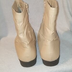 Genuine Crinkled Tan leather upper. Inner side zipper. Warm Faux fur lined. Rubber Trwaded outsole. Heel height 3/4". Outside heel to toe length <10". Width at ball under boot 3". Not really wide. New without tags.
