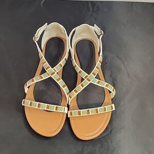 BEADED LEATHER UPPER CRISSCROSS STRAP BACK ANKLE BUCKLE STRAP CLOSURE SANDAL SIZE 9 1/2M COLOR WHITE, ORANGE AND MORE THIS ITEMS IS PRE-OWNED EXCELLENT CONDITION WITH ONLY LIGHT SIGNS OF WEAR IF ANY CHECK THE PICTURES