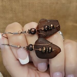 Chunks of amber sea glass, tumbled by nature, with hand wound with copper wire and bronzed beads. Hypoallergenic wires.