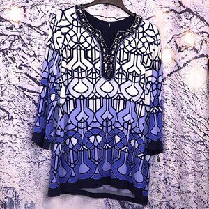BEADED STAINED GLASS TUNIC 2X Blue White Metallic Beach Packable Vacation Casual