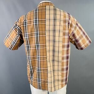 BEAMS HEART short sleeve shirt in a brown, black, and white cotton blend fabric featuring mixed plaid patterns, one pocket, and button closure.