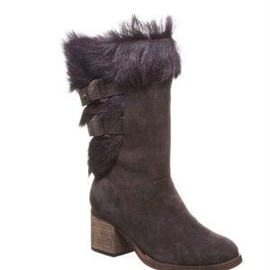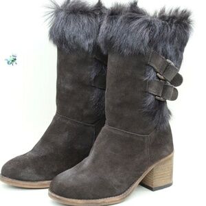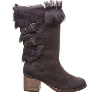 The boots are made of cow suede with a genuine goat fur upper and are lined with cozy Sherpa fleece. They feature a 2.5-inch block heel, strap detailing with a double D-ring, and a textured rubber outsole. These boots are also treated with NeverWet technology for water repellency.