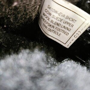 THESE BEARPAW EMMA BLACK WOMEN'S SHORT SUEDE BOOTS, SIZE 10 offers style that can be worn with denim jeans, a casual skirt or dress or an outfit of your choice while breezing around town. These boots are made of leather suede and features a luxuriously soft lining that provides a comfortable cushioning which gives additional comfort; cow suede upper, sheepskin and wool blend lining, woven heel, visible logos. Boot opening circumference measures 14.5, 8.5" tall. Preowned. Shows signs of wear mostly on heel. Good Condition.