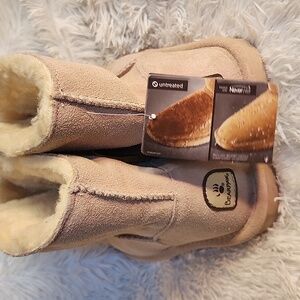 BEARPAW Suede Sheepskin Pom Pom Boot single faux fur pom pom provides all the flourish you need to make an adorable impression. Prance through the season in style wearing these cozy, water-repellent boots and pay little mind to frosty temps nipping at your toes.