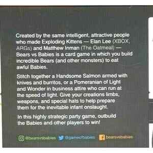 Looking to add some hilarious fun to your game nights? I'm selling the Bears vs Babies card game by Exploding Kittens. I've only played it once, so it's in excellent condition and ready for a new home!