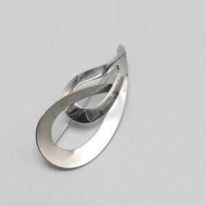 This brooch embodies a modernist aesthetic with its interlocked teardrop design, enhancing any sophisticated attire. Crafted from sterling silver, it offers elegance and durability.