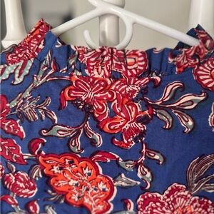 Beau & Ro Stylish blouse with vibrant floral patterns. Features a mix of red and blue colors. Ruffled collar