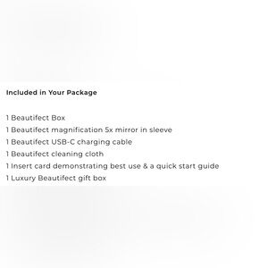 Includes: Beautifect box, 5x magnification mirror in sleeve, USB-C charging cable, cleaning cloth, insert card demonstrating best use and quick start guide and it all comes in the Beautifect gift box ๐๐