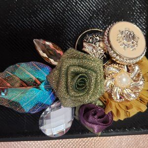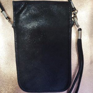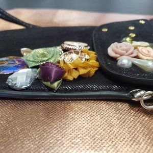 This bag is beautifully embellished with fabric rosette flowers, pearls, buttons and crystal in 3-D... the embellishments are raised up from the bag. The bag is made from a soft black fabric that has a sheen to it. It can be used as a crossbody or wristlet. Both straps are detachable. The wrist strap is 6" and the long strap is 24" (doubled). It should fit most cell phones. My 6.5" x 4" Samsung note will fit.