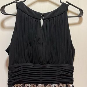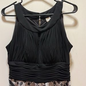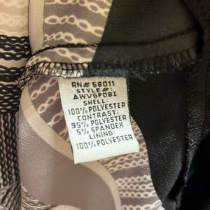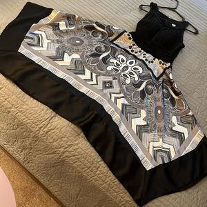 Beautiful dancing dress black, gray and white design print. Tight top with cup padding and stretchy waistband made with polyester and spandex, flowy scarf bottom