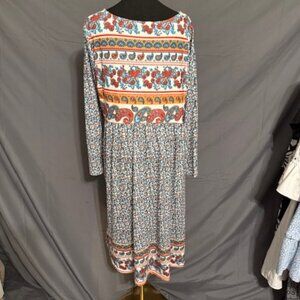 This beautiful dress in size L is a floral patterned knee-length overall dress designed for women. It features a round neckline, long sleeves, and a pullover closure for easy wear. The dress is multicolored and made from a knit fabric, offering both style and comfort for any occasion.
