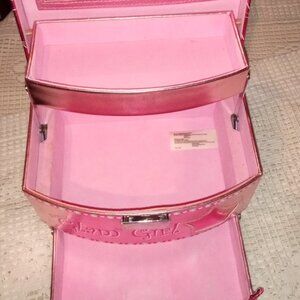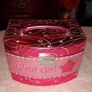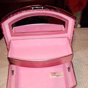 1. BEAUTIFUL PINK AND SILVER GLAM GIRL TRAVEL JEWELRY BOX WITH CARRY HANDLE. 8" INCHES LONG AND 6" INCHES WIDE AND 6" INCHES TALL. GREAT CONDITION!