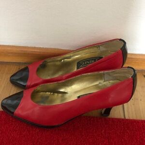 ALTHOUGH VINTAGE THESE HEELS ARE IN VERY GOOD CONDITION AND READY FOR SOMEONE WHO LOVES SHOES WITH A LITTLE DRAMA. THE BLACK AND RED COMBINATION IN LEATHER (+ PATENT) ARE STRIKING AND COMFORTABLE AND WEAR IS MINIMAL. PURCHASED IN NEW YORK AT BLOOMINGDALES.