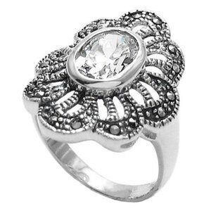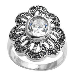 Stunning flower ring with marcasite petals and a brilliant clear CZ center stone. Delicate, elegant, beautiful.