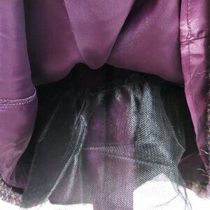 Plum wool blend woven with subtle metallic gold lamé threads. Fully lined. With internal boning and multi-layer tulle-trimmed hem.