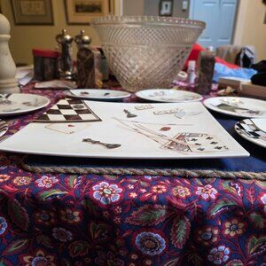 NRW UNUSUAL HAND PAINTED GIEN OF FRANCE PLAYFUL PORCELAIN GAMES PLATE SET including 11 1/2 INCH LARGE SQUARE SERVING PLATE FOR APPETIZERS: DESSERTS OR SUSHI AND SIX SMALLER 6 1/2 INCH ROUND SMALLER SERVONG PLATED. SET WAS PURCHASED AT WILLIAM SONOMA IN DC AND REMAINS ON ORIGINAL BOX. EACH PLATE IS LABELED ON BACK BY THE FAMOUS BONE CHINA HOUSE GIEN FRANCE. ORIGINAL PRICE SH0WN WAS $146, NEARLY DOUBLE TODAY FOR VINTAGE SET. WINDERFUL ORIGINAL GIFT FOR ALL GAMES PLAYERS.