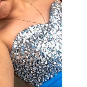 prom dress worn once, blue with sequence, altered on bottom. hooks on back to connect straps. zipper with fish hook.