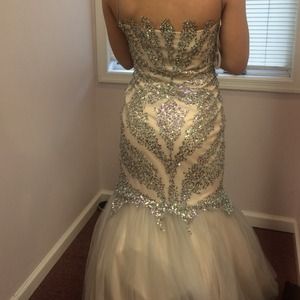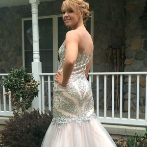 Nude color mermaid style prom dress with grey/silver chiffon overlay! Embroidered with silver gems! Very form fitting and elegant! Has only been warn once