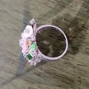 Genuine red garnet, green diopside, citrine, white topaz with green and red enameling. Very pretty carved shell flowers. 925 sterling silver with platinum plating to keep from tarnishing. Sizable 8. VERY well made piece. RARE.