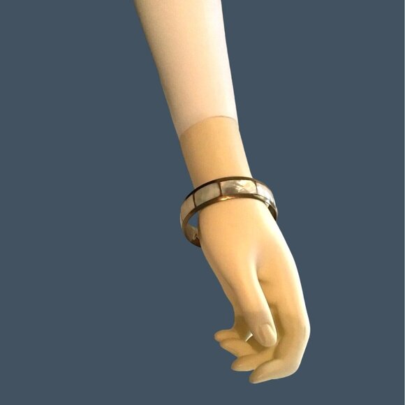 Elevate any ensemble with this stunning gold and white tone bangle bracelet. Its elegant design and versatile hues make it an ideal accessory for any occasion, adding a touch of sophistication and charm to your look.